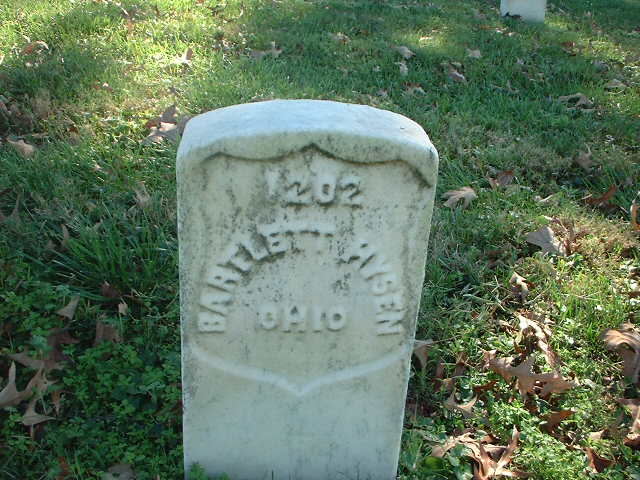 Bartlett was 22 years old when he enlisted in Company D of the 18th Ohio Volunteers. He was wounded at the Battle of Chickamauga and died on November 3, 1863 at Chattanooga. He is buried in the Chattanooga National Cemetery in grave A1202 overlooking the Tennessee Valley and the city of Chattanooga.