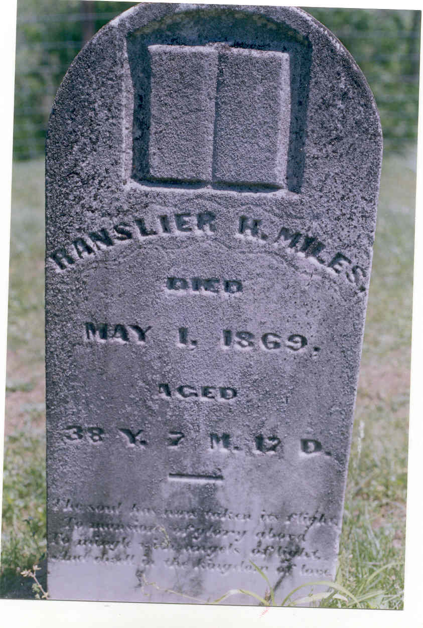 He enlisted in Co D, of the 18th Ohio on September 23, 1861 for a period of three years. However, a journal written by Archelaus S. Camp, 1st Sergeant of Company D., mentions the discharge of R. Miles on July 19, 1862. A check of his service and pension records tells us that he was discharged on July 20, 1862 by reason of "chronic bronchitis." It does appear that he re-enlisted. He was assigned to Company B of the 18th Ohio Veteran Volunteer Infantry. At the end of the war, the 18th was primarily serving as a Pioneer (or Engineer) Regiment. On or about December 13, 1864, he was injured while building a dam near Nashville. His left hand was smashed when it was caught between a timber and a rock. He lost the use of his hand when complications from Gangrene set in to his hand. He served until October 9, 1865 and arrived back in Columbus on October 22, 1865. Ranslier died on May 1, 1869 from complications of his wound in 1864 in Lodi Township, Athens County, Ohio and is buried in the Garden Cemetery near present day Shade, Ohio.