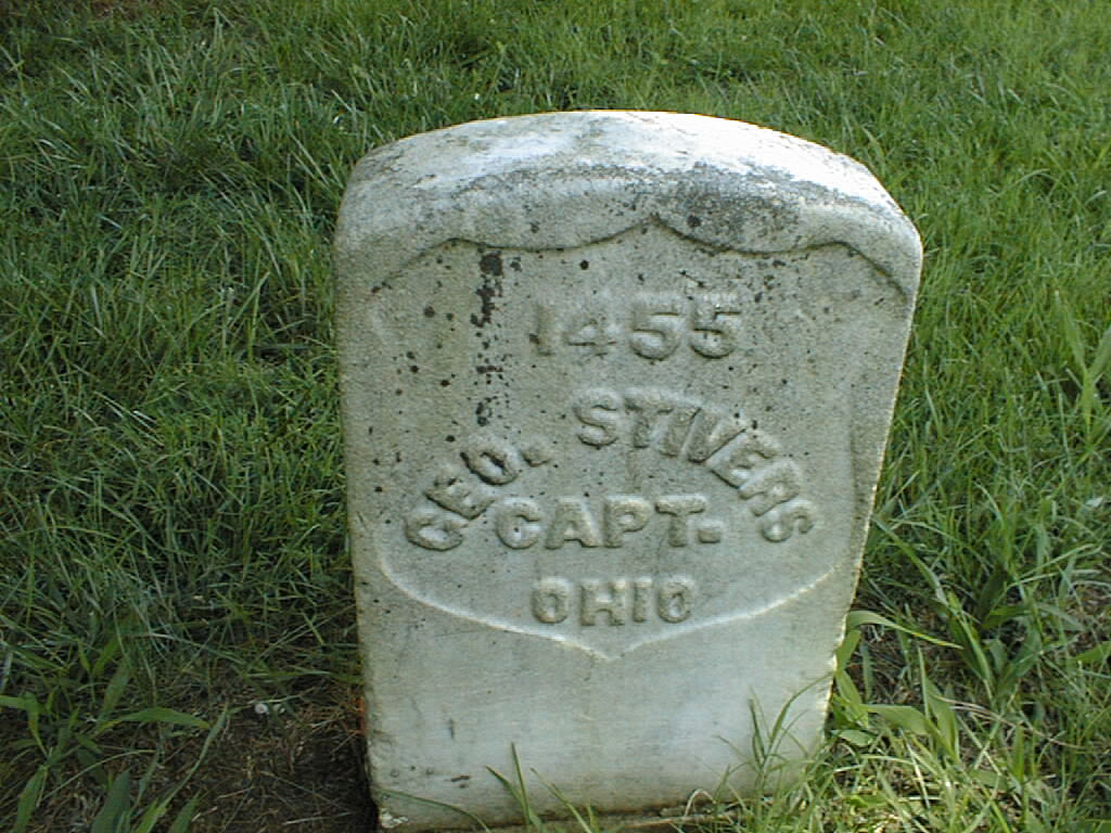 George Stivers was enlisted into the service on October 21, 1861 at Camp Dennison and assigned to be the Captain of Company K of the 18th Ohio Volunteers under Colonel T. R. Stanley. Captain Stivers appears to have been a well liked officer in his company and regiment. He led his company throughout the early campaigns of 1862. He was leading his company in the Battle of Stones River on the fatal afternoon of January 2, 1863. Company K was heavily involved in the charge across Stones River which broke up Confederate General john Breckinridge's attack which sealed the union victory at Murfreesboro. A Confederate Sharpshooter's bullet found Captain Stiver as depicted in the pencil drawing by Harper's Weekly artist, Henry Lovie, and fell mortally wounded in the chest near the railroad bridge over Stones River. In a coma, he lay in the makeshift hospital attended by Dr. William Parker Johnson where he succumbed to his wound on January 4th, 1863. He is buried in the Stones River National Cemetery at Murfreesboro, Tennessee.