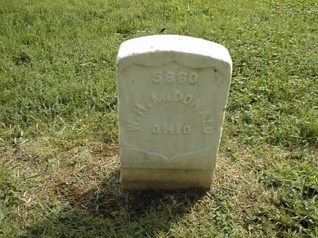 William H. McDaniel, mistaken for McDonald was wounded at the Battle of Stones River, Murfreesboro, Tennessee on December 31, 1862. He died the following year on March 31, 1863. He is buried in the Stones River National Cemetery.